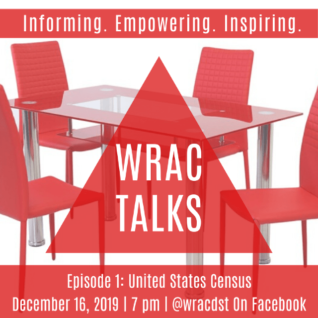Introducing WRAC Talks! A series of shows that are “Informing, Empowering and Inspiring”. Our first episode will air Monday, December 16th at 7 pm, on our Facebook page (https://www.facebook.com/wracdst). Please tell your friends and famiy to tune in. Around the table on the first episode we discuss the importance of the upcoming 2020 Census, featuring guests from the US Census Bureau and Fair Count organizations. We can’t wait to share this information with you. Join us and get ready for the premiere of WRAC Talks!